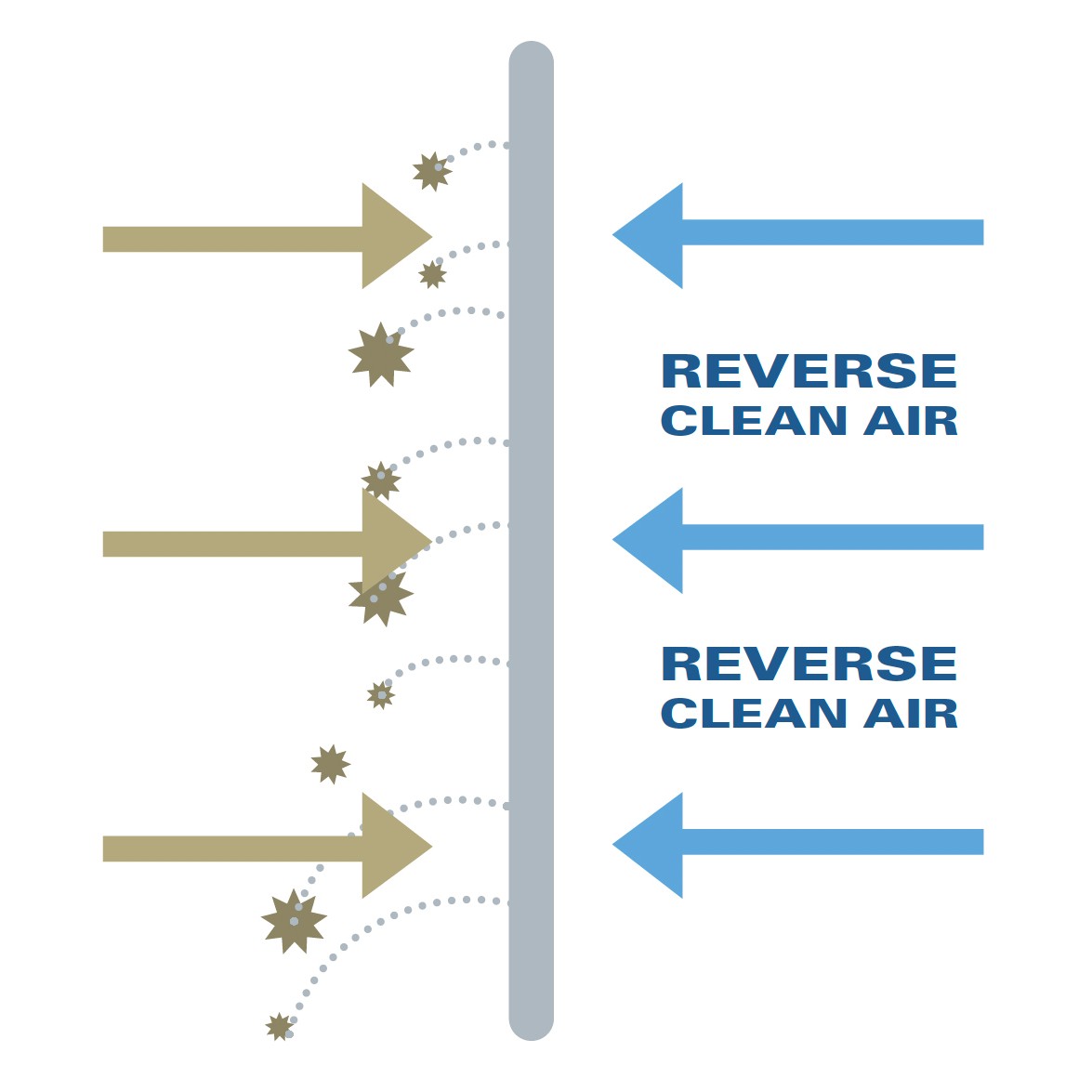 Reverse Air Cleaning introduced an air flow in the opposite direction of the filtered air (Figure 3). The reverse air flow would penetrate the filter media from the clean filter side and knock the dust cake off the outer surface of the filter. Multiple methods were used to accomplish the reverse flow including both fans and compressed air.