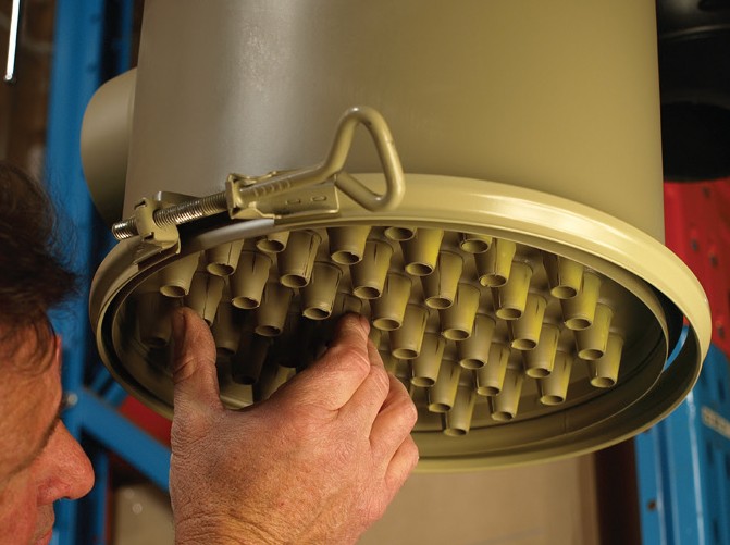 If the tubes carry light dust, remove it with a stiff brush. If plugging with fibrous material is evident, remove the Strata™ or Donaclone™ section. Clean it with compressed air or water no hotter than 72° C / 160° F. Any time the Donaclone tube lower body is removed, the body gaskets should be replaced. When reinstalling the dust cup, be sure it seals 360° around the air cleaner body.