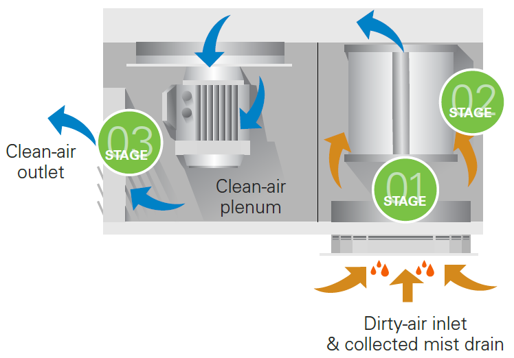 En este punto, el aire todavía contiene pequeñas gotas de neblina. El elemento filtrante es el núcleo del colector de neblina, ya que garantiza que solo el aire limpio regrese a la nave. El filtro se coloca en vertical, permitiendo que las gotas se purguen y se capten partículas adicionales en la corriente de aire.