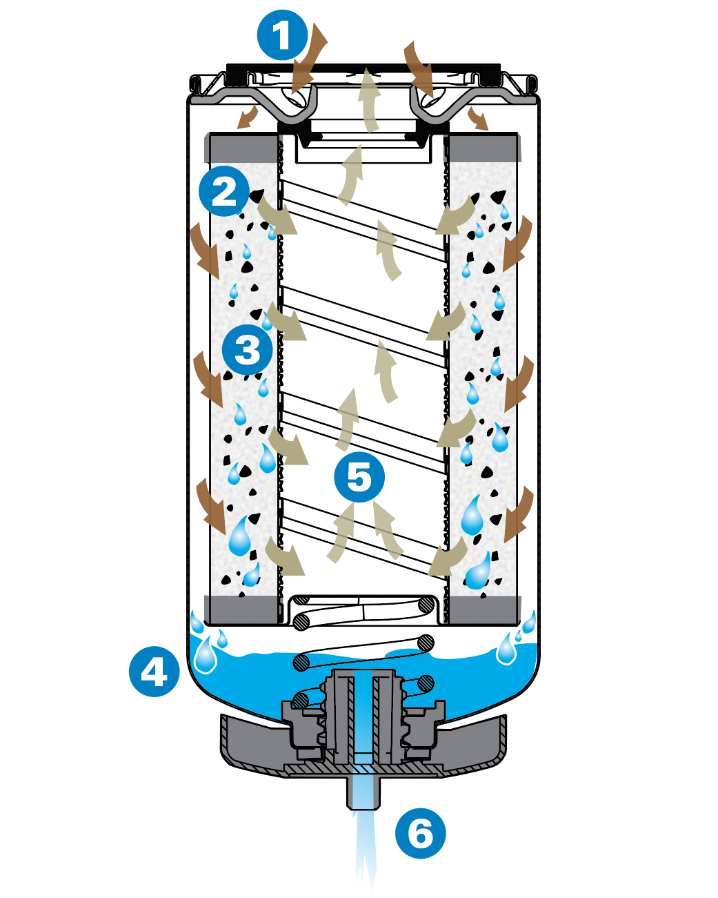 - Las pequeñas gotas de agua se fusionan en gotas más grandes que caen al depósito inferior de la base del filtro.