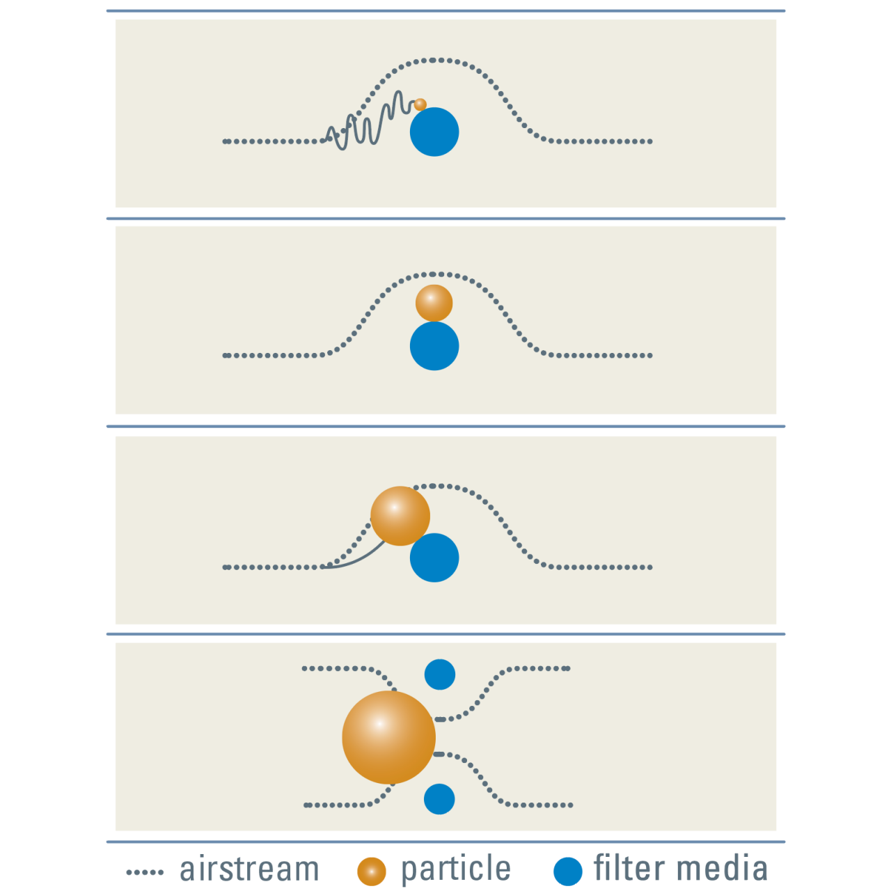 El impacto funciona en partículas de mayor tamaño que no pueden mantener los cambios de dirección del flujo a través del filtro. La masa de estas partículas las hace volar directamente hacia una fibra cuando el aire cambia de dirección.