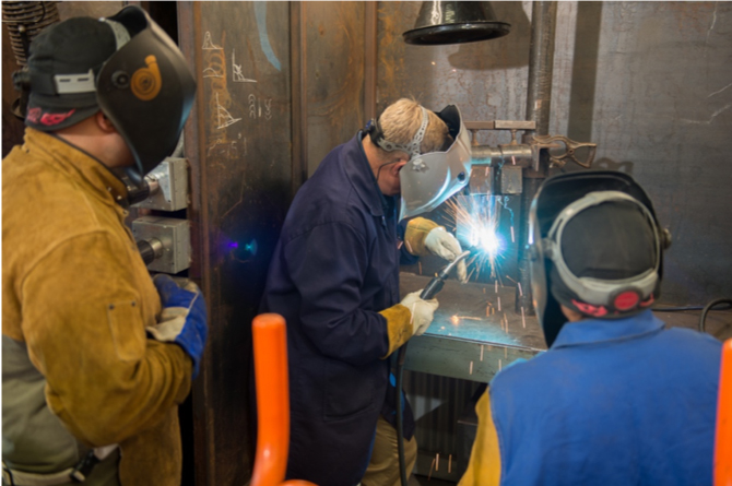 Workshops for Warriors à San Diego dispose de plusieurs stations de soudage avec des bras d'extraction à la source reliés à un dépoussiéreur central Donaldson Torit® Downflo® Oval.