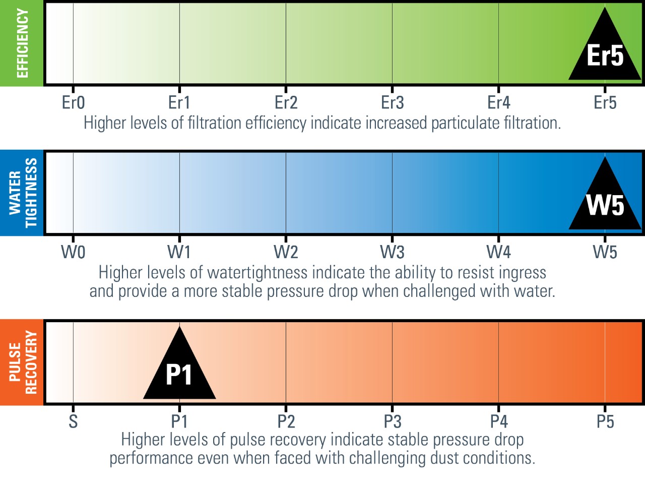 Il profilo Er|W|P consente il confronto fra parametri identici e una migliore corrispondenza della scala di valutazione del filtro dell'aria in ingresso di Donaldson inoltre aiuta la conversione degli impianti alla giusta soluzione di filtrazione per le condizioni operative e ambientali specifiche. Se l'ambiente di un impianto o le condizioni operative si modificano, Donaldson può aiutare l'impianto a scegliere la filtrazione appropriata in base a efficienza (Er), tenuta stagna (W) e recupero degli impulsi (P): i tre attributi che differiscono maggiormente da un filtro all'altro e, in combinazione, determinano anche i costi operativi.