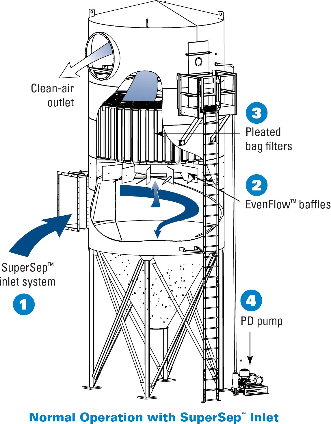 SuperSep™インレットシステムは、サイクロン式の事前分離機能とバグハウスを1つの集塵機に統合し、最大97%の粉塵を事前に分離するため、フィルターをより長く清潔に保つことができます。