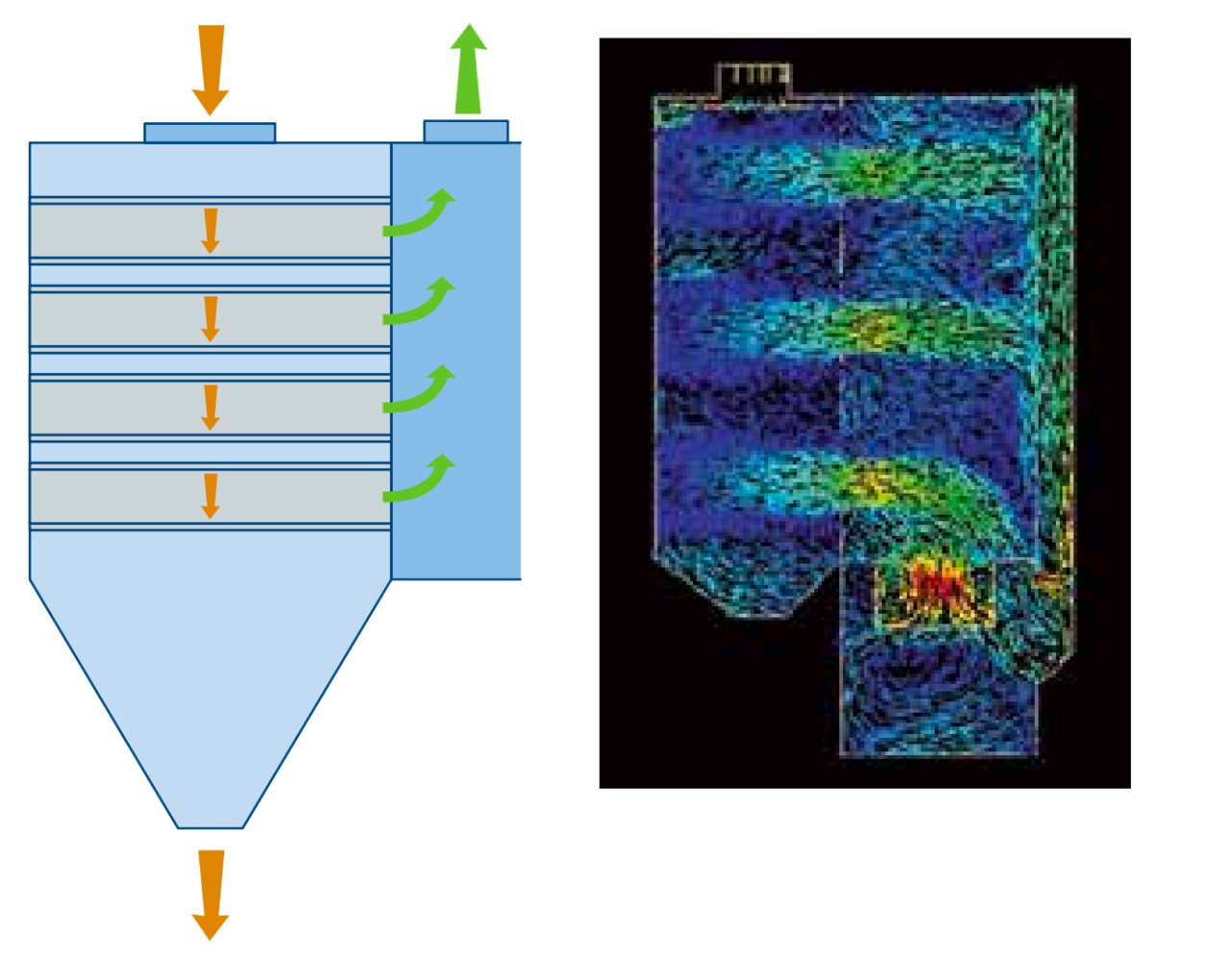 이러한 초기 집진기는 오래된 백하우스 기술을 넘어서는 발전이었지만, 여전히 개선이 필요했습니다. 1980년대 초 즈음, 새로운 설계 개선으로 집진기 성능은 더욱 향상되었습니다. 이 새로운 설계에서는 하향식 공기 흐름 설계를 통합해 중력을 활용하여 기류에서 먼지를 제거했습니다.