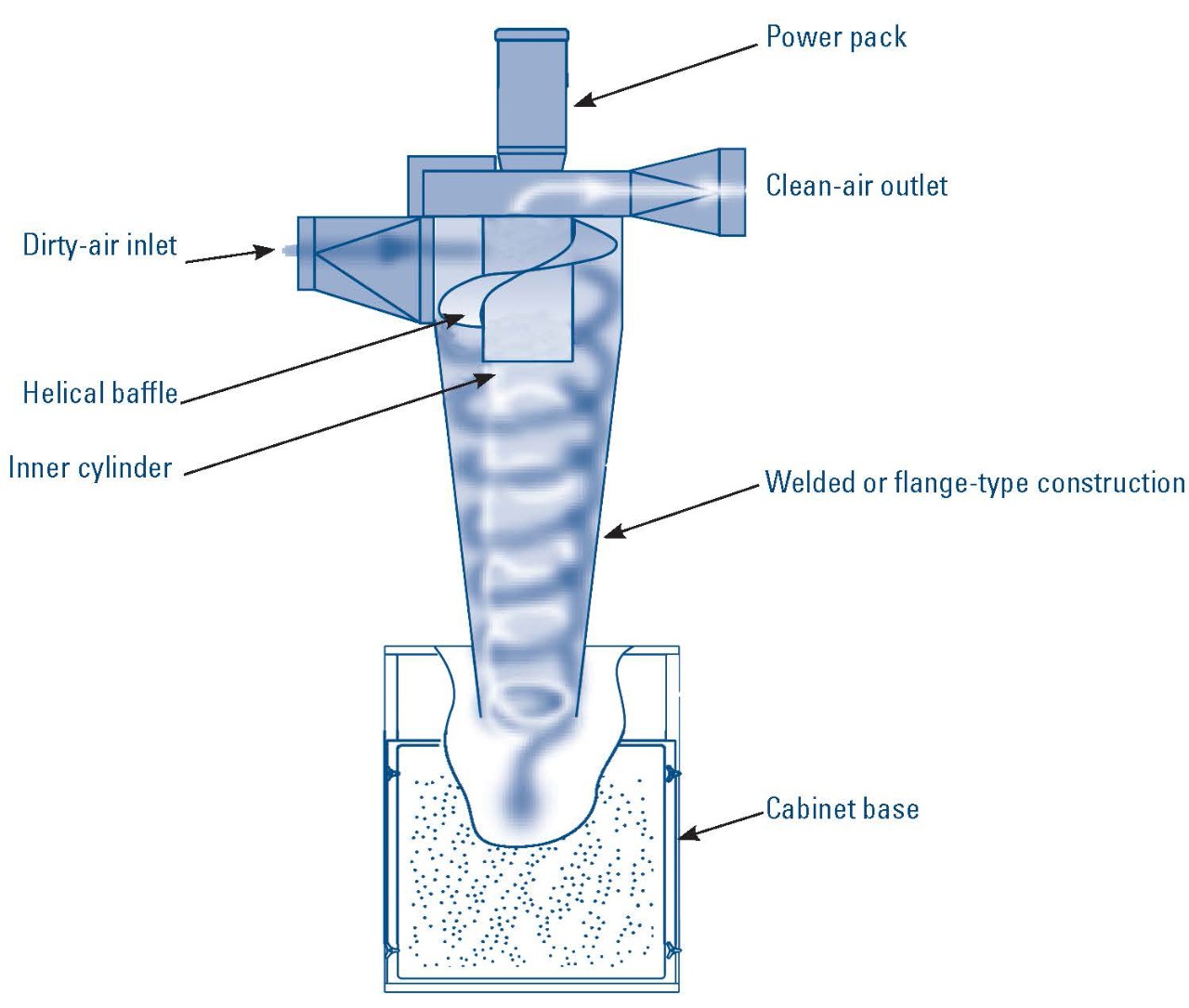 Zapylone powietrze dostaje się do urządzenia przez wlot powietrza i jest kierowane przez przegrodę śrubową. Siła odśrodkowa przesuwa cięższy pył w kierunku wewnętrznych ścianek bocznych i przenosi go do podstawy urządzenia. Czyste powietrze przepływa przez wewnętrzny cylinder i jest odprowadzane do atmosfery lub opcjonalnych filtrów końcowych.