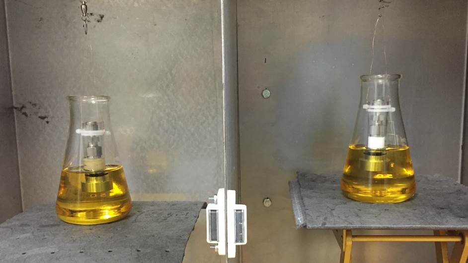 Rys. 4: podczas porównania medium oleofobowego Synteq (po lewej) ze zwykłymi mediami sorbentowymi te drugie uległy nasyceniu po 45 minutach i ważyły 2,08 g. Oleofobowe medium Synteq ważyło 0,07 g, absorbując 30 razy mniej oleju w tym samym czasie.