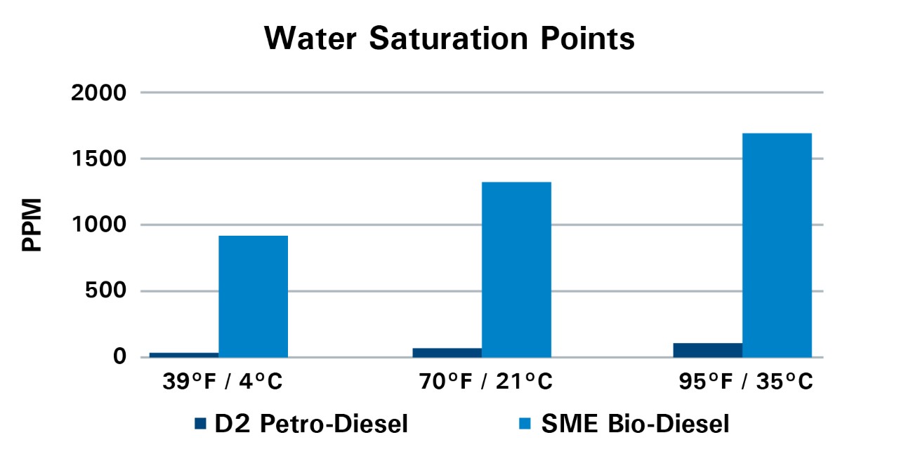 - Choć biodiesel zawiera więcej wody niż petrodiesel, mieszanie obu tych gatunków paliwa nie pozwala uzyskać prostej średniej. W wyniku procesu mieszania może powstawać woda niezwiązana.