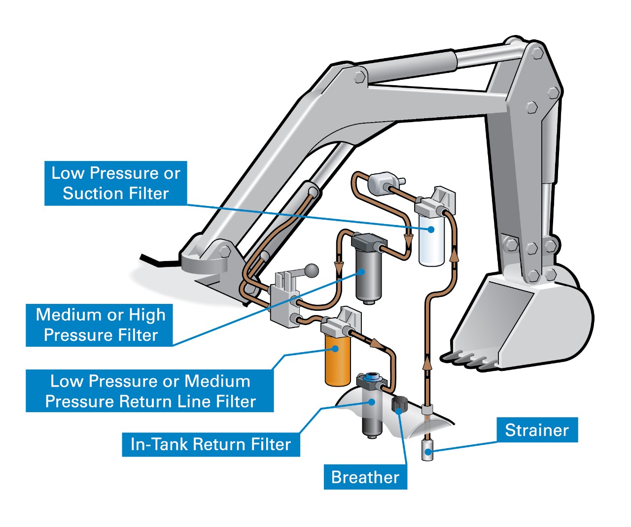 Najlepiej byłoby, gdyby każdy stopień układu hydraulicznego był wyposażony w osobny filtr, zainstalowany przed każdym podzespołem i za nim. Obecna sytuacja, w tym ograniczone budżety, niewielka ilość dostępnej przestrzeni i straty ciśnienia w filtrach powodują jednak, że należy znaleźć złoty środek pomiędzy ochroną a praktycznym podejściem.