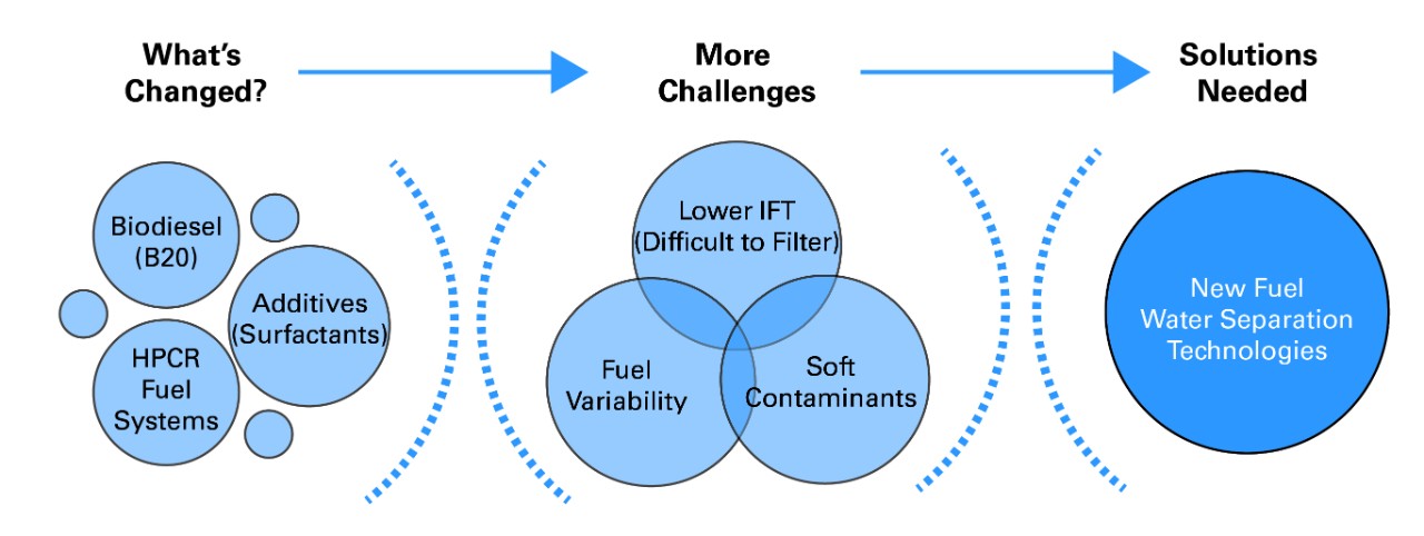 Em segundo lugar, os sistemas injetores HPCR são mais sensíveis à água do que os sistemas mais antigos; por causa da pressão mais alta (pense na lavadora de alta pressão), pode causar danos, ineficiência, falha prematura do injetor e tempo de inatividade não planejado. Para proteger esses sistemas, é essencial remover o máximo de água possível do combustível antes que ele chegue aos injetores e, eventualmente, à câmara de combustão.