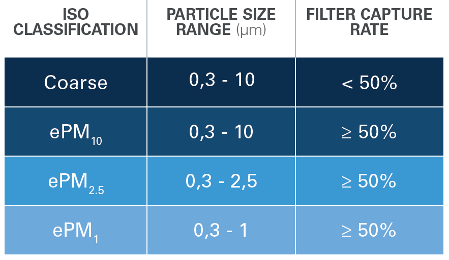 A ISO 16890 expressa a eficiência do filtro com base no nível de proteção alcançado contra o tamanho da matéria particulada (PM) em quatro categorias: Grosso, ePM10, ePM2,5 e ePM1.