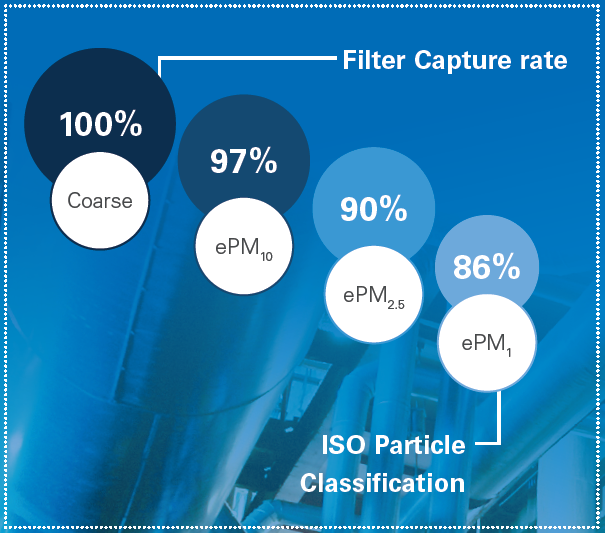 Os elementos filtrantes de ar, de acordo com a série ISO 16890, são avaliados em laboratório pela sua capacidade de remover partículas de aerossol, expressa pelos valores de eficiência ePM1, ePM2,5 e ePM10.