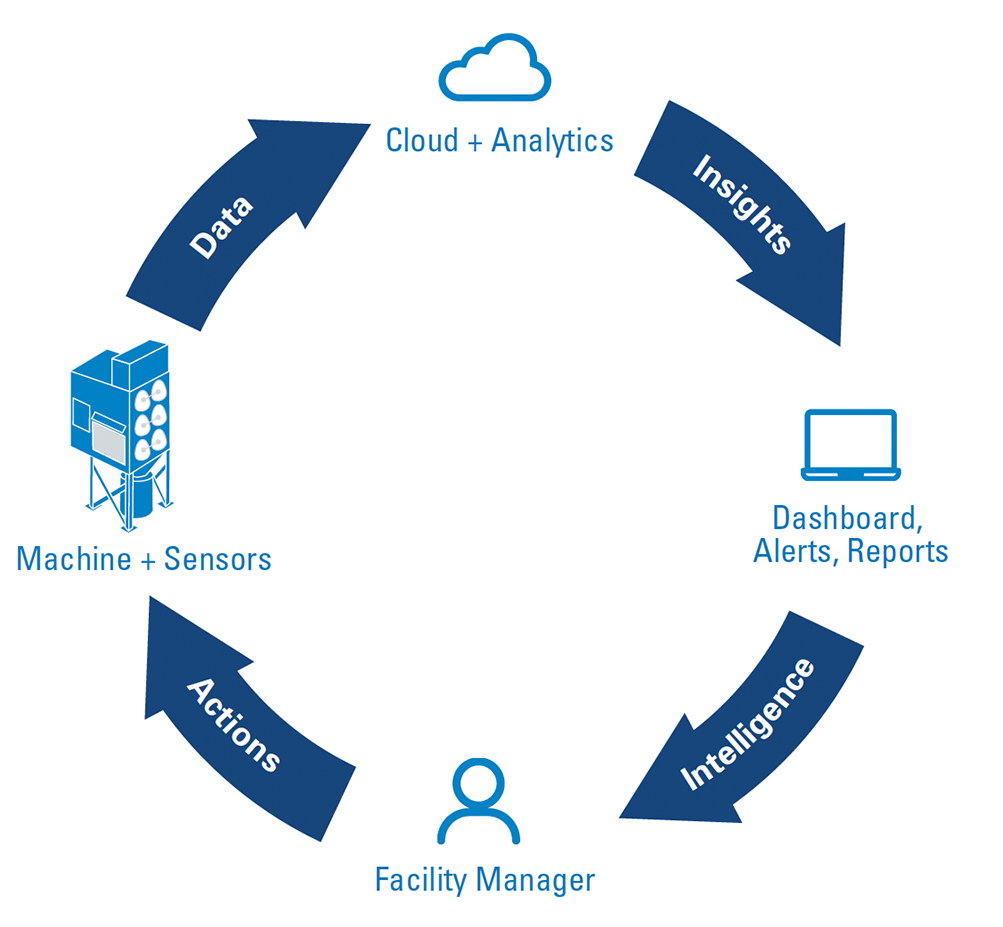 压差、颗粒物趋势和气流趋势这三个指标对于 EHS 领导进行跟踪和报告具有直接相关的重要性。然而,除尘器的优化管理可能也是您与工厂工程和维护同事都关心的问题。为了你们的共同利益,可使用额外传感器来增强 iCue™ 联网过滤服务,特别是监测除尘罩堵塞、除尘桶粉尘水平、压缩空气供给和湿度。持续监测这些指标有助于尽早发现问题,从而管理除尘器的总拥有成本并推动 iCue™ 服务的额外投资回报。